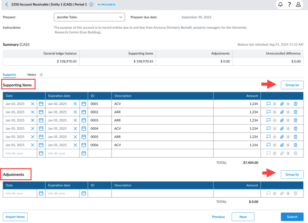 Users can now use the Group By button to organize adjustments and supporting items by Date or Description. This feature provides a clearer breakdown of amounts by key categories, making it easier to review and identify totals for invoices, expenses, and other supporting items.