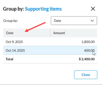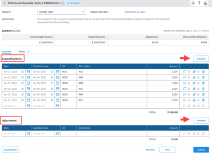 Use the Group By button to organize adjustments and supporting items by Date or Description, to make it easier to review totals and identify related entries. It provides clearer breakdowns of amounts by key categories, making it easier to identify totals for invoices, expenses, or other supporting items.