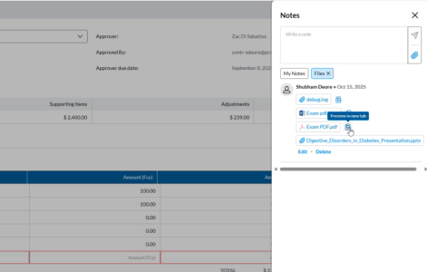 Adding a comment or file to an adjustment or supporting item helps you and the Approver communicate clearly and work together efficiently. It is a way to give more details about the adjustment or supporting item.