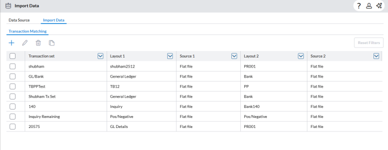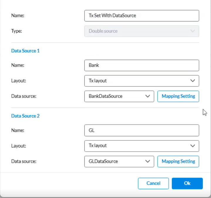 By defining Data Source and adding Transaction Sets, you establish the connection points that users rely on when running reconciliation tasks. Once configured, these settings enable users to import transactions, perform automated matching, and view validation results directly within the reconciliation process.