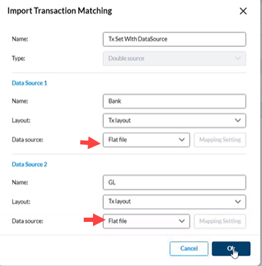 To perform transaction matching using data imported from Data Integration, you must set up two separate data sources — for example, one for bank transactions and another for general ledger balances.
