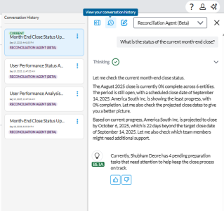 Note: As you interact with agent or assistant, your conversations are logged. Your session history remains available even if you switch to a different agent or assistant. To remove your conversation history, click the Clear Chat icon.