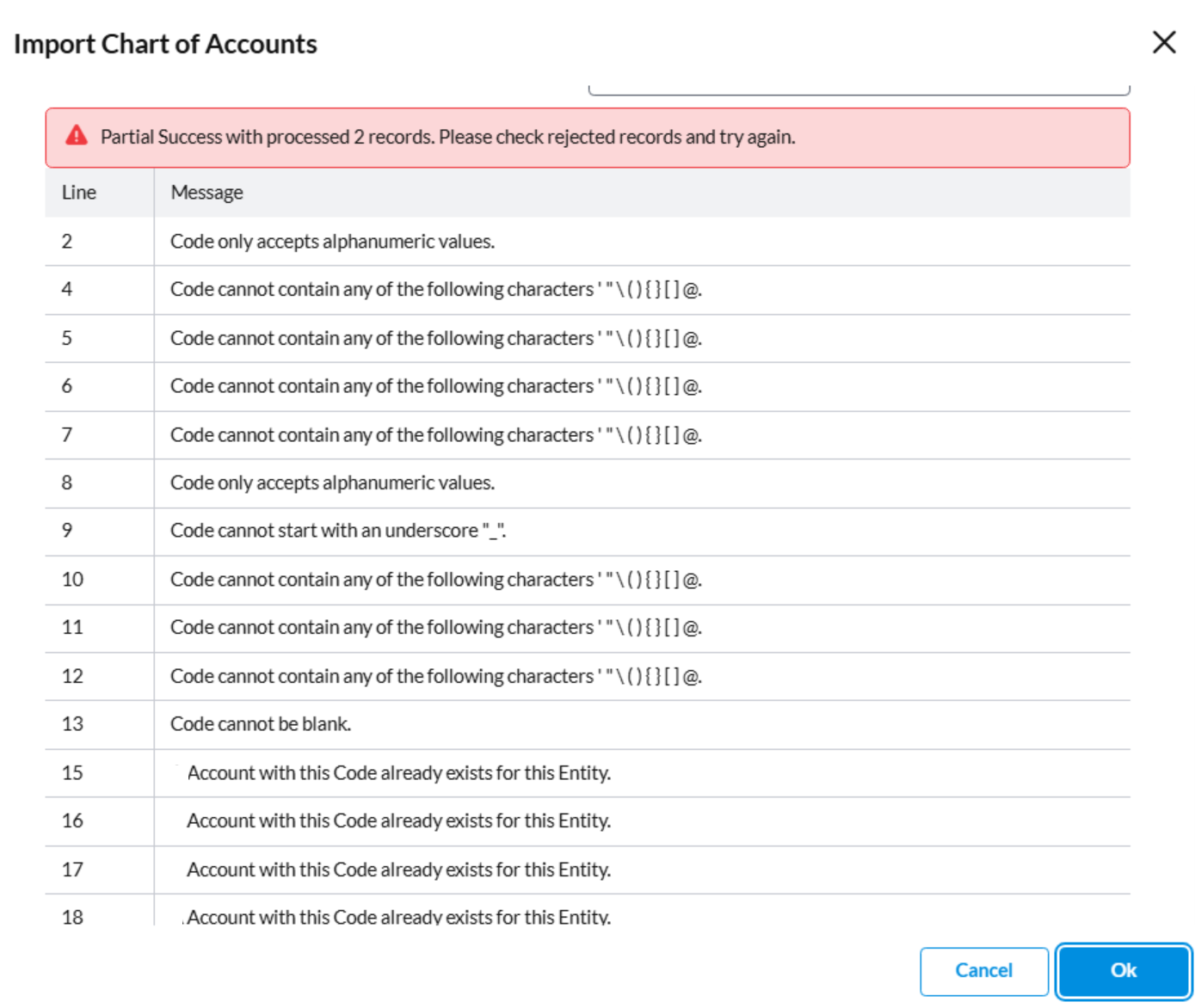 Duplicate codes are not allowed within the same Entity. An attempt to use a code that already exists triggers in an error.